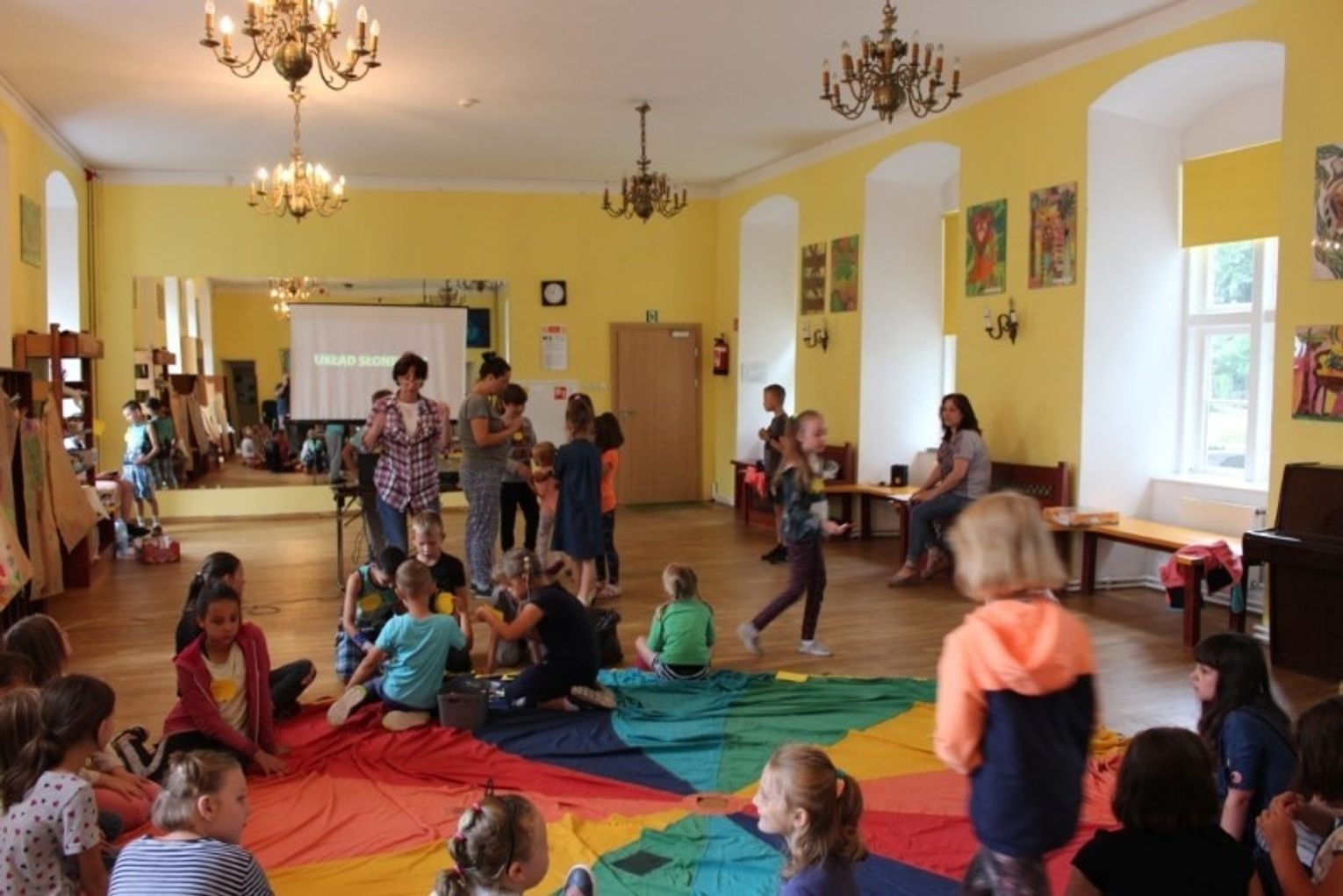 Pogoda dopisała, więc wszyscy bawili się świetnie na "pałacowym podwórku", gdzie głównym elementem zabaw była fruwająca i falująca chusta klanzowska.