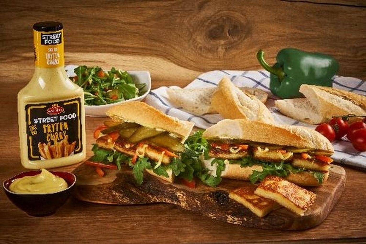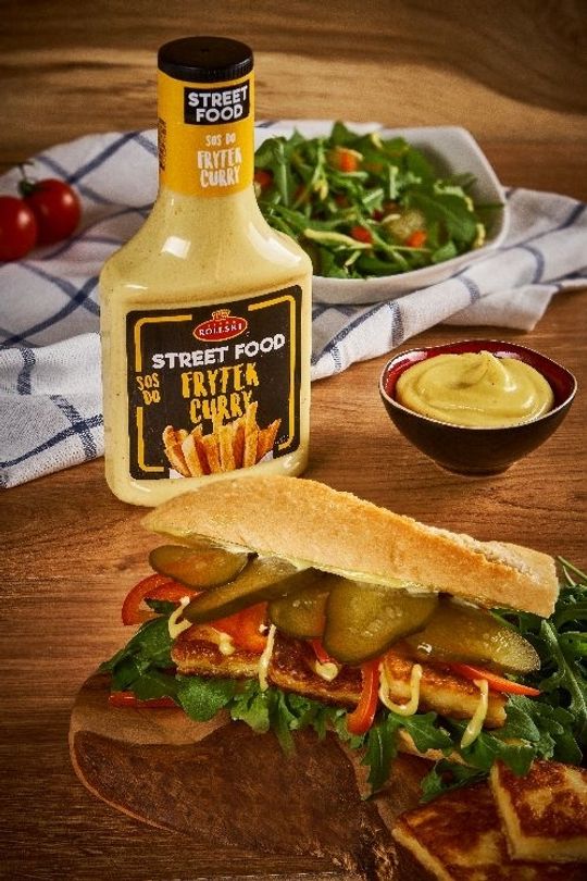 Bagietka z dodatkami to danie idealne, które można zjeść w domu czy zabrać na wynos. Przygotowując ją, możemy puścić wodze fantazji i wypełnić ją niezwykłymi produktami, takimi jak ser halloumi. Dzięki swojemu oryginalnemu, lekko słonemu posmakowi idealnie łączy się ze świeżymi warzywami, jak i owocami. Aby nasza bagietka była idealna, warto postawić na dodatek w postaci Sosu do Frytek Curry od Roleski. Sos z linii Street Food nie zawiera glutenu, GMO, konserwantów oraz glutaminianu sodu, a dzięki perfekcyjnie połączonym składnikom, charakterystycznej kwaskowości octu i aromatycznej mieszance przypraw curry, idealnie skomponuje się ze smakiem sera halloumi.