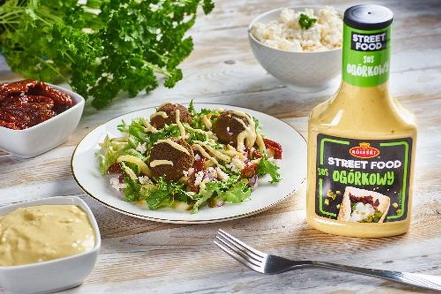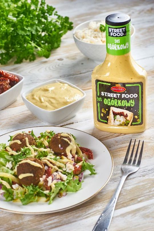 - Na talerzu układamy po 3 falafele, posypujemy wędzonym twarogiem i polewamy sosem ogórkowym Roleski z linii Street food.