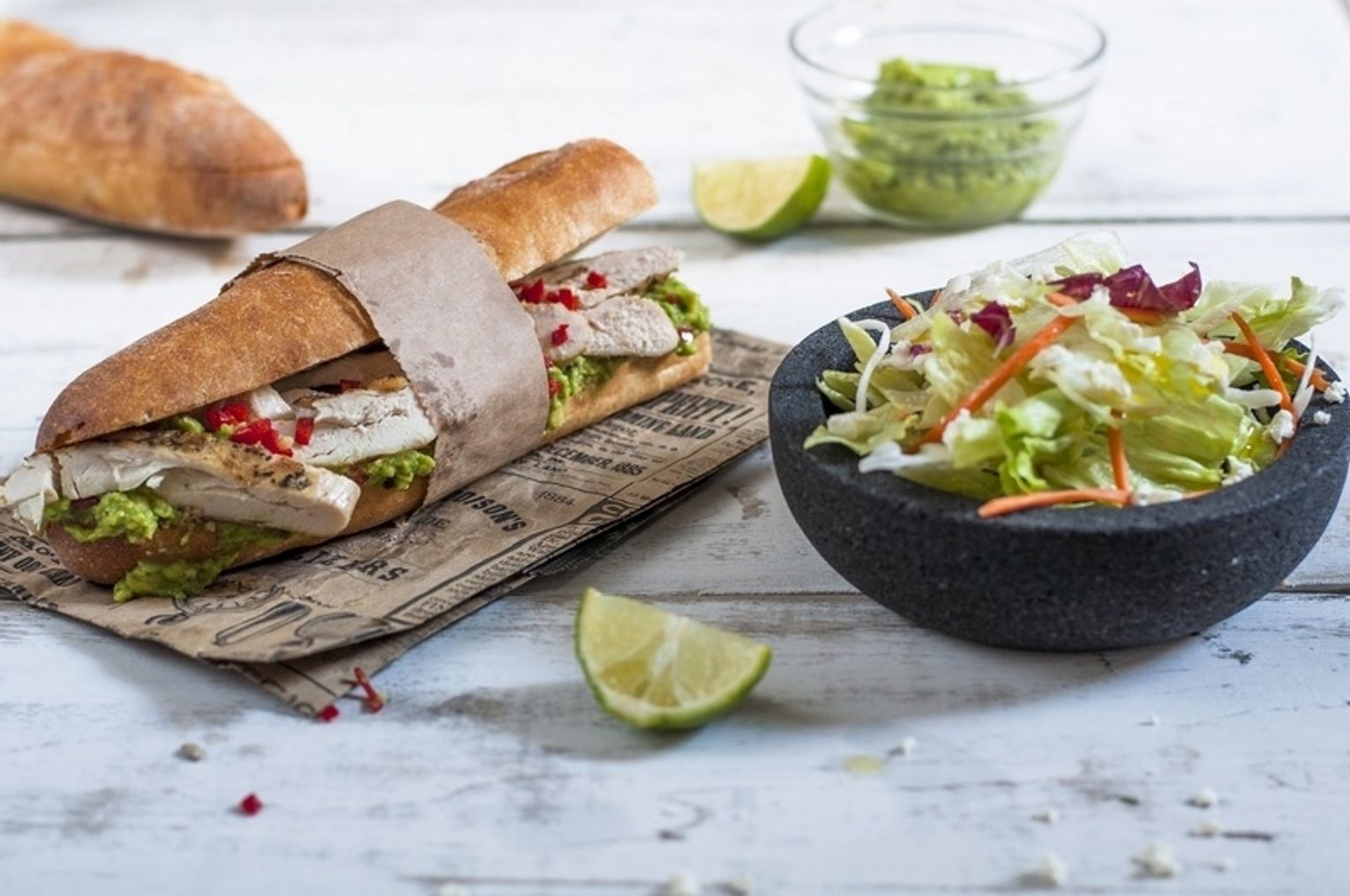 Bagietkę przekrój na pół, posmaruj ją kremem z awokado. Plastry z piersi z kurczaka umieść w kanapce, posypując je uprzednio świeżym chili. Podawaj z sałatką.