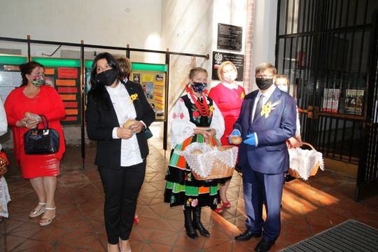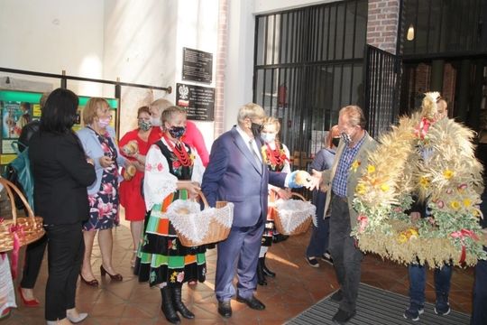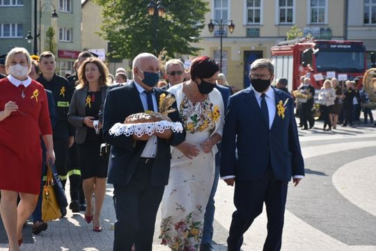 Wszyscy uczestnicy otrzymali z rąk burmistrza i starosty dożynek okolicznościowe chlebki wypieczone z tegorocznej mąki.