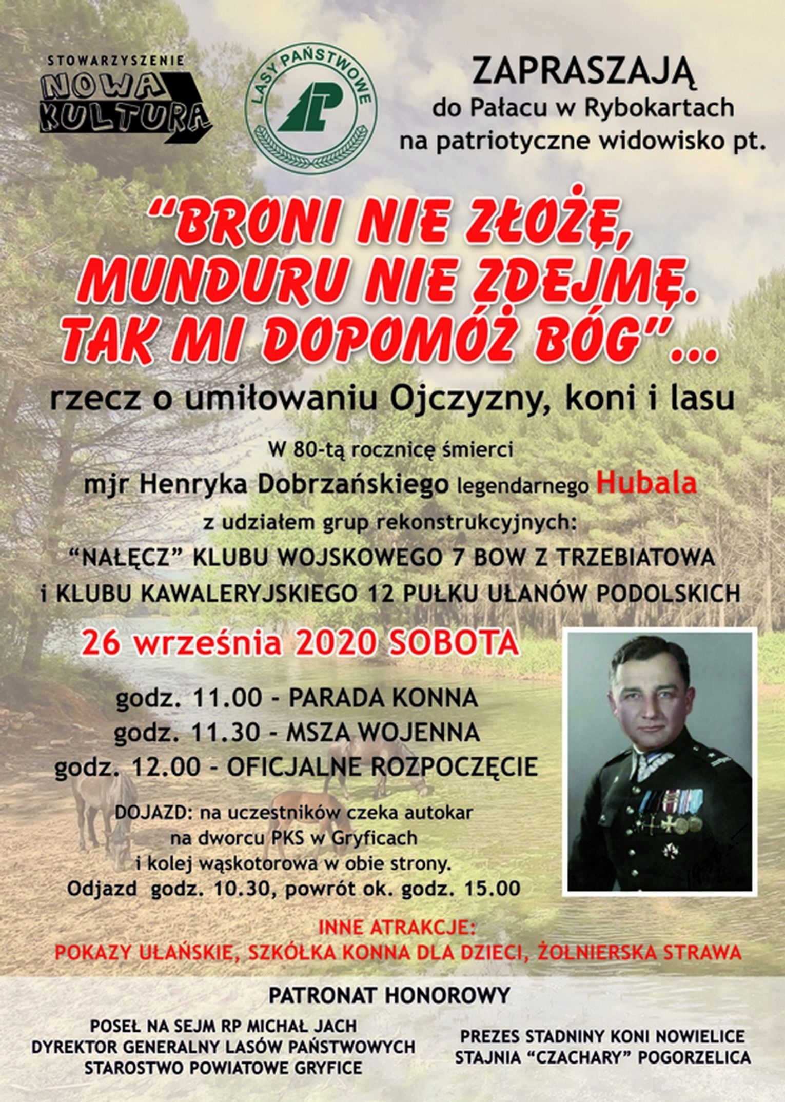 12.00 – 12.25 Uroczyste posadzenie dębu poświęconego Majorowi Henrykowi Dobrzańskiemu ps. „Hubal".