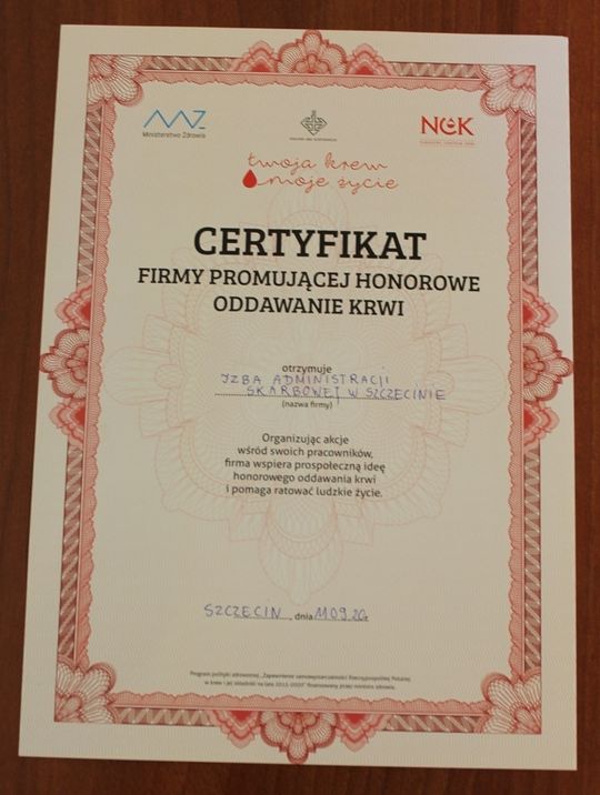 22 września br. z okazji Święta Krajowej Administracji Skarbowej z inicjatywy Dyrektora Jarosława Grzelaka, odbyła się Akcja Krwiodawstwa pn. "Twoja krew, moje życie". Akcja oddawania krwi miała miejsce w siedzibie Izby Administracji Skarbowej w Szczecinie. To już kolejna taka akcja.