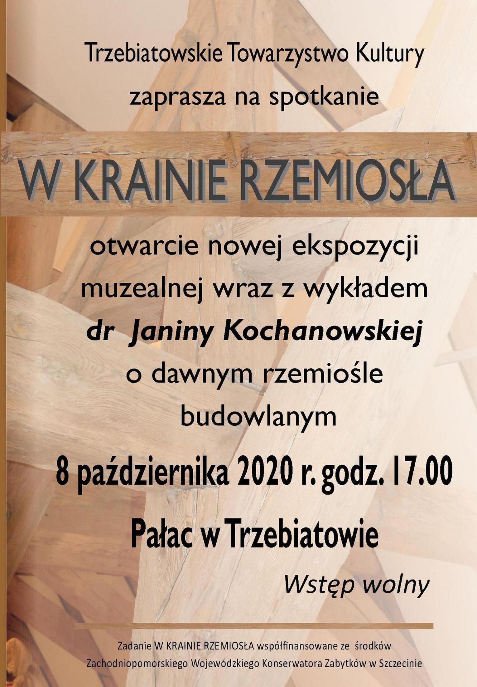 Trzebiatowskie Towarzystwo Kultury realizuje zadanie W KRAINIE RZEMIOSŁA współfinansowane ze środków Zachodniopomorskiego Wojewódzkiego Konserwatora Zabytków w Szczecinie. Jego celem jest zaprezentowanie w Muzeum Pałacowym stałej wystawy z zachowaną, barokową więźbą dachową – jedną z najstarszych na Pomorzu Zachodnim oraz wyrobów rzemiosła budowlanego. Ponadto zależy nam na propagowaniu wiedzy o sposobie konstruowania więźby i innych elementów z drewna, pracy cieśli oraz rzemieślników (np. strycharzy, stolarzy czy kowali), których wyroby umożliwiały tworzenie konstrukcji zabytkowych budynków.