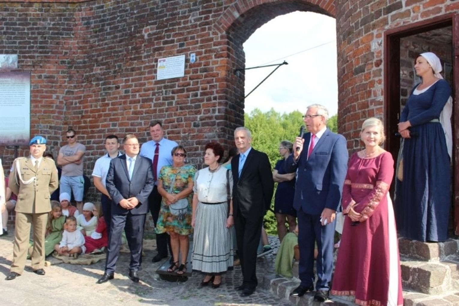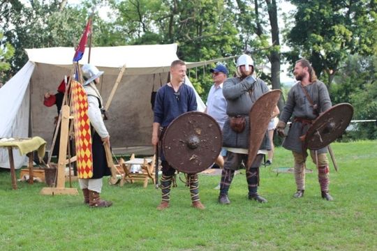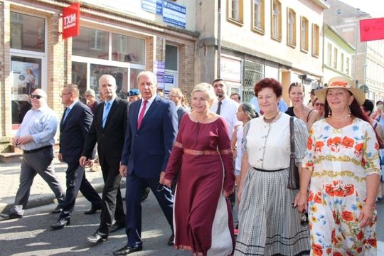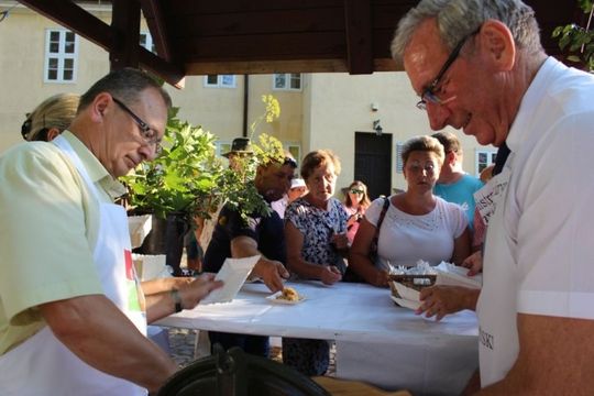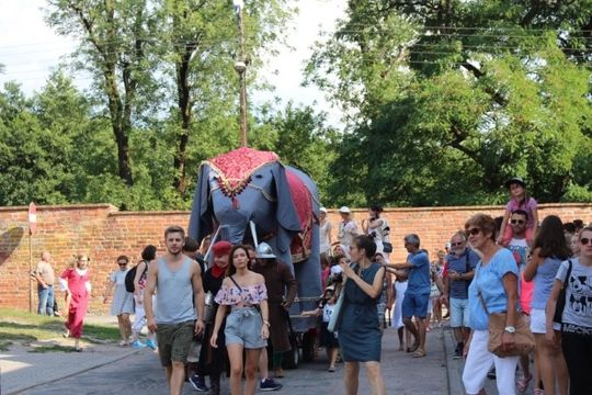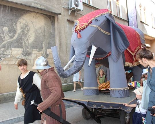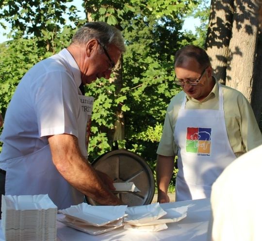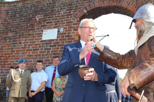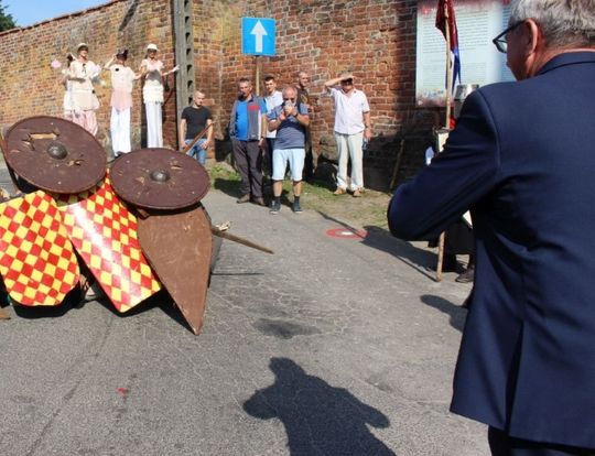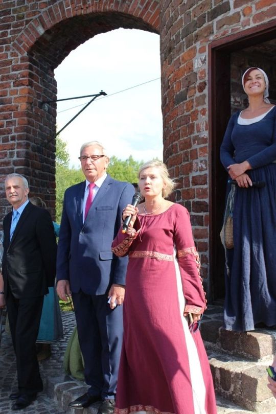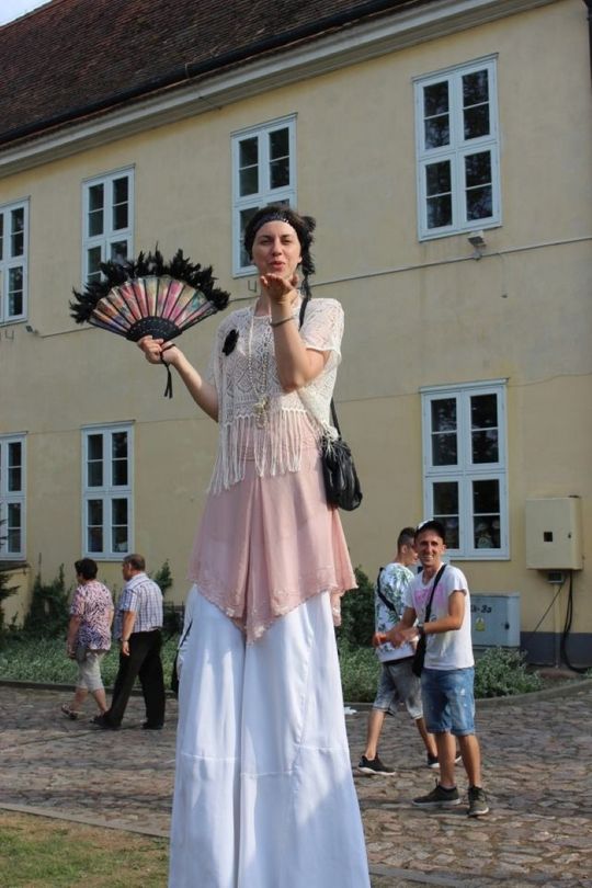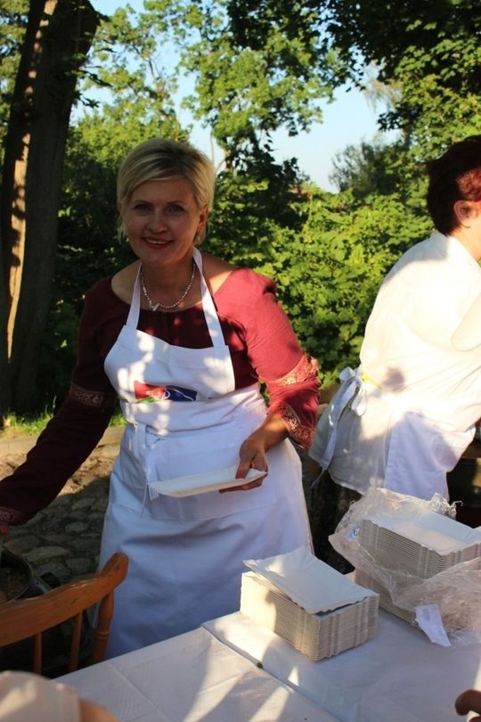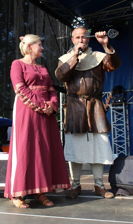 II dnia nasze świętowanie rozpoczęliśmy pod Basztą Kaszaną ,gdzie po wysłuchaniu legendy barwnie przedstawionej przez Katarzynę Mularz ze Stowarzyszenia Rekonstrukcji Historycznej Chąśba, jak to miska kaszy uratowała Trzebiatów, symbolicznej obrony przed atakiem gryficzan dokonał burmistrz Trzebiatowa Józef Domański. Rozbite fragmenty misy uczestnicy happeningu zabrali ze sobą na szczęście. Mogliśmy również zobaczyć taniec wczesnośredniowieczny przygotowany pod kierunkiem Katarzyny Mularz. Spod baszty barwny korowód szczudlarzy, wojów, zaproszonych gości, mieszkańców i turystów przeszedł pod pałac. Na przedzie dumnie „kroczyła” bohaterka innego ważnego wydarzenia w dziejach Trzebiatowa – odrestaurowana słonica Hansken. Dźwięk hejnału, napisany dla Trzebiatowa przez prof. Waleriana Pawłowskiego był sygnałem Inauguracji Święta Kaszy, której dokonali burmistrz Trzebiatowa Józef Domański i dyrektor Trzebiatowskiego Ośrodka Kultury Renata Teresa Korek, wraz zaproszonymi gośćmi: Marszałkiem Województwa Zachodniopomorskiego Jarosławem Rzepą, Wicestarostą Powiatu Gryfickiego Ireneuszem Wojciechowiczem, Przewodniczącym Rady Powiatu Gryfickiego Markiem Gołuchowskim, Janem Kaniewiczem Przewodniczącym Rady Miejskiej Trzebiatowa. Klucz do bram miasta przekazano wojom MOHORTA, którzy rozbili swoje obozowisko, gdzie odbywały się walki, pokazy uzbrojenia, a także wypiekano smaczne podpłomyki. Szczudlarze – Aktorzy Teatru Gry i Ludzie zaskakiwali uczestników święta…swoim wysokim wzrostem, pozowali do zdjęć i zapraszali do wspólnej zabawy. Już od godz.14 zwiedzić można było Młyn na ul. Słowackiego 59, po którym oprowadzał i barwnie opowiadał ostatni młynarz Zygmunt Adamek, oraz przypłynąć do nas z Borzęcina wraz z Piratami podczas zorganizowanego przez Wikingów Regi spływu kajakowego „O miskę kaszy”. Pani Anna Szwedko przekazała do naszej Galerii swój obraz „Odbicie kościoła w wodzie”, a Joanna Jankowska przepiękny, artystyczny kwiatowy kapelusz.