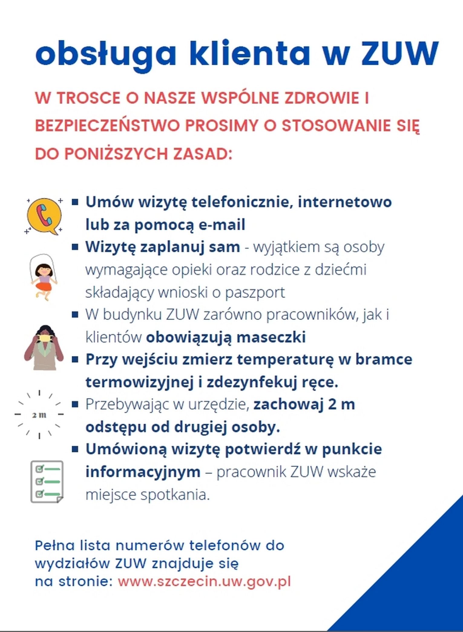 Urzędnicy ZUW dziś rozpoczęli pracę w trybie zmianowym – połowa pracuje na miejscu w urzędzie, a druga połowa – zdalnie. Ma to ograniczyć transmisję koronawirusa i jednocześnie zapewnić ciągłość pracy urzędu. Dla klientów ZUW bez zmian pozostają zasady obsługi, opisane na naszej stronie: https://www.szczecin.uw.gov.pl/?type=article&action=view&id=1