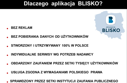 Jednym z powodów, dla którego Policja zdecydowała się na nadawanie w BLISKO jest to, że aplikacja należy do bezpiecznego systemu SISMS, którego działanie sprawdza się w kilkuset samorządach, od dużych miast do niewielkich gmin m.in. w Gdańsku, Bydgoszczy, Radomiu, Częstochowie, Bełchatowie, Legnicy.
