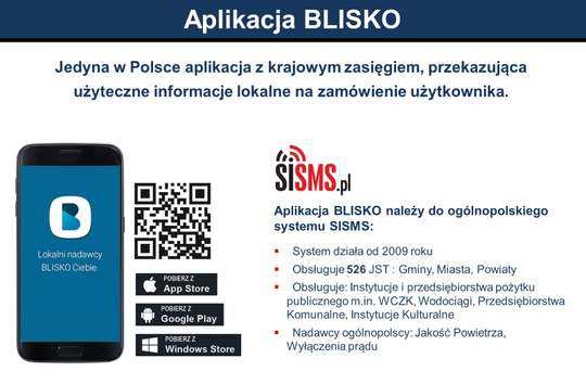 Aplikacja BLISKO należy do ogólnopolskiego systemu SISMS, z którego korzysta blisko pół tysięcy polskich miast i gmin. Jego podstawową funkcją jest umożliwienie służbom administracyjnym masowe powiadamianie ludności w szybki i skuteczny sposób. W dobie rozwoju technologii i wynikającego z tego szumu informacyjnego, przekazywanie wiadomości na telefon jest najbardziej efektywnym sposobem komunikacji, gwarantującym odczytanie treści.