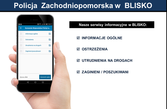 O czym zamierza nas informować zachodniopomorska Policja w aplikacji BLISKO? Przede wszystkim o utrudnieniach na drogach regionu, o zagrożeniach konkretnymi przestępstwami lub zmianami w obowiązujących przepisach. Wszystkie informacje z KWP w Szczecinie mogą być odbierane przez użytkowników, którzy wybiorą w aplikacji miejscowość z obszaru województwa zachodniopomorskiego.