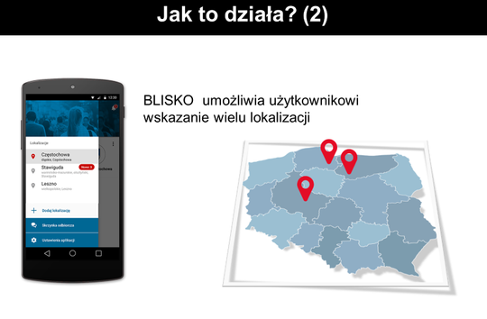 Aplikacja BLISKO jest bardzo wygodna, ponieważ sama powiadamia o każdym nowym wpisie, podobnie jak przy dostarczeniu wiadomości SMS. Umożliwia użytkownikom wybranie wielu lokalizacji, tzn. można zaznaczyć Koszalin, ale też inne miejscowości, w których bywamy. Po wskazaniu miejsca aplikacja wyświetli aktualną listę nadawców, którzy informują na danym obszarze. Są takie lokalizacje, w których znajdziemy jedynie nadawców ogólnopolskich, jednak można mieć pewność, że będą przesyłać jedynie wiadomości o charakterze lokalnym.
