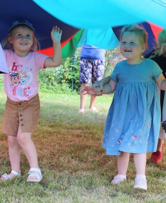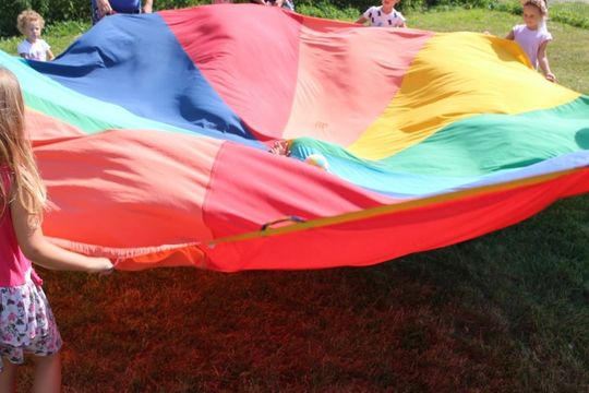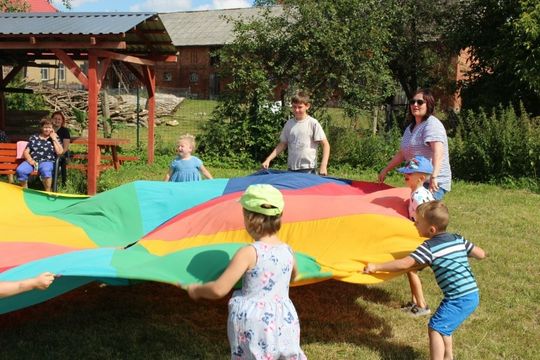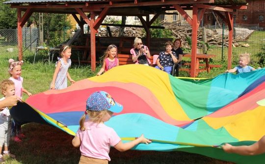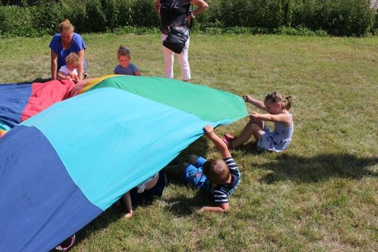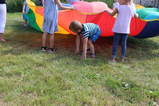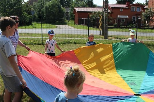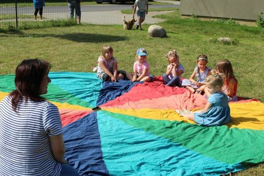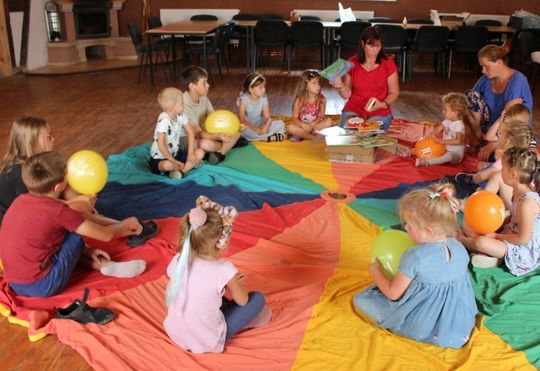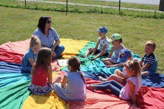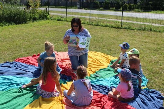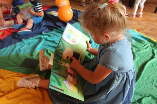 Zabawy z chustą klanzowską – to ulubiony element każdego spotkania. Następnie dzieci wykonały samodzielnie, według swoich pomysłów zakładki do książek. Na koniec bardzo miły akcent -wręczenie książeczek, które są pamiątką i nagrodą za pracę podczas zajęć oraz owocowy, zdrowy poczęstunek.