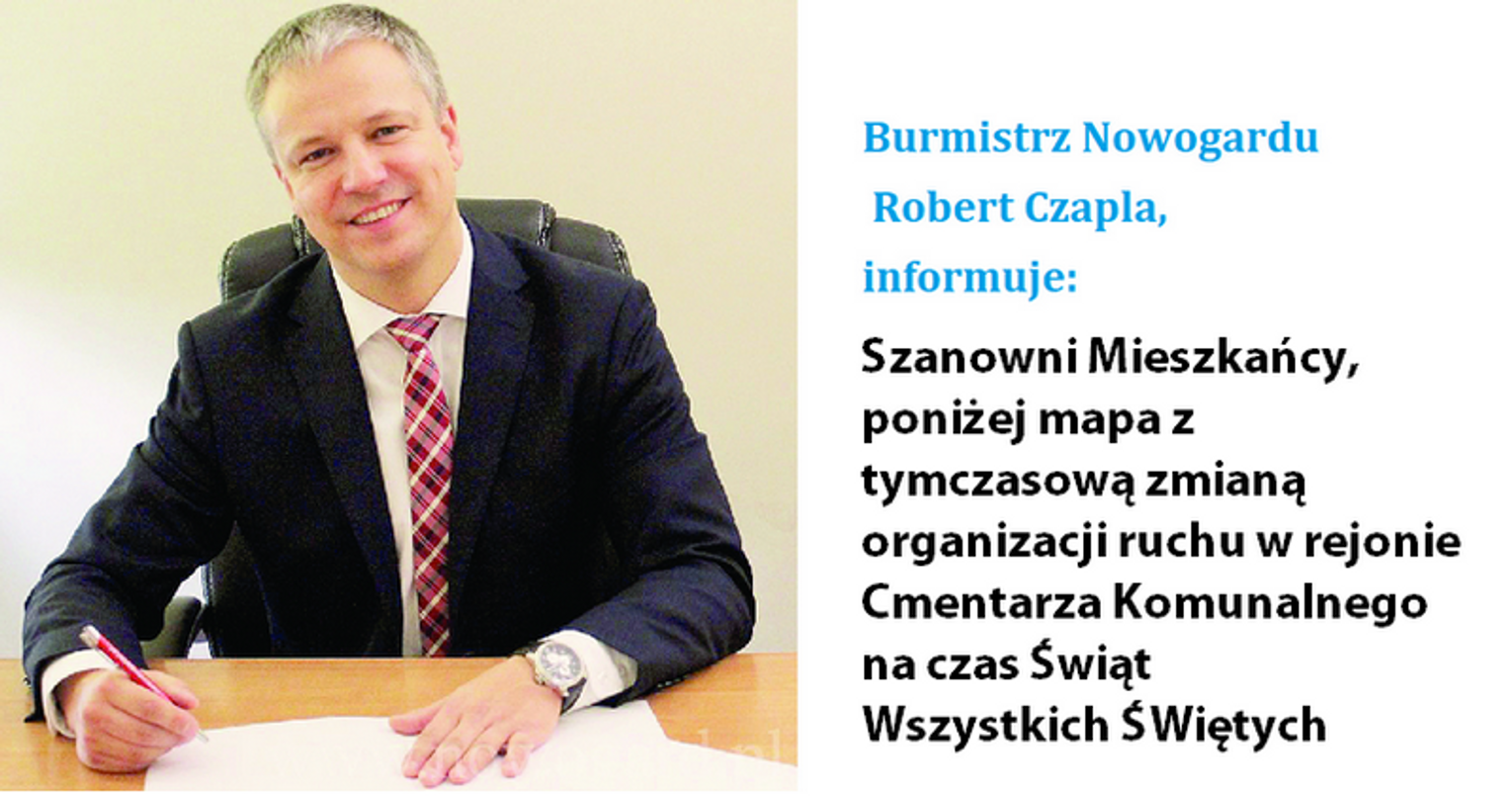 Pragnę poinformować Państwa, że jak co roku w okresie Świąt Wszystkich Świętych w dniach 30.10 – 02.11.2018 na ulicach przy cmentarzu komunalnym w Nowogardzie będzie zmiana organizacji ruchu w sposób następujący: