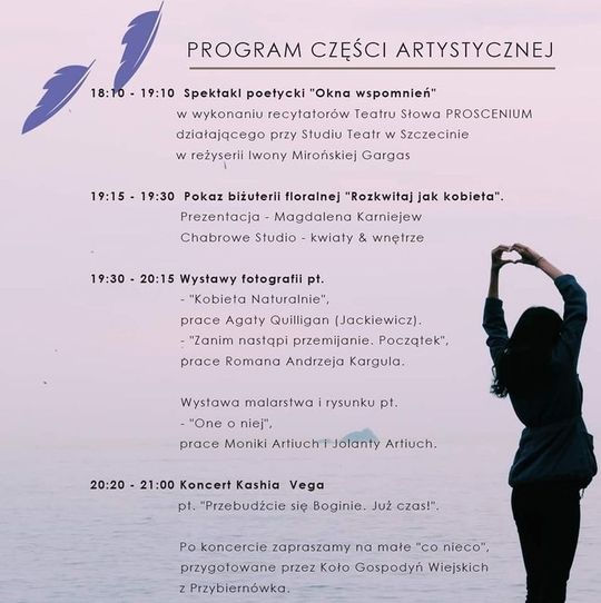 Pragniemy Państwu zaprezentować twórcze działania kobiet na wielu płaszczyznach. Nie tylko tych słuchowych i wizualnych, które prezentują: Iwona Mirońska Gargas ze swoim Studiem Teatr, Agata Quilligan z przedstawianymi fotografiami kobiet, Magdalena Karniejew ze swoimi cudeńkami z kwiatów, Monika Artiuch i Jola Artiuch ze swoimi obrazami, czy Kashia Vega ze swoimi piosenkami mocy, będącymi manifestami kobiecości, ale również na płaszczyźnie kulinarnej - spróbujecie Państwo pysznych ciast upieczonych przez panie z Koła Gospodyń Wiejskich z Przybiernówka.