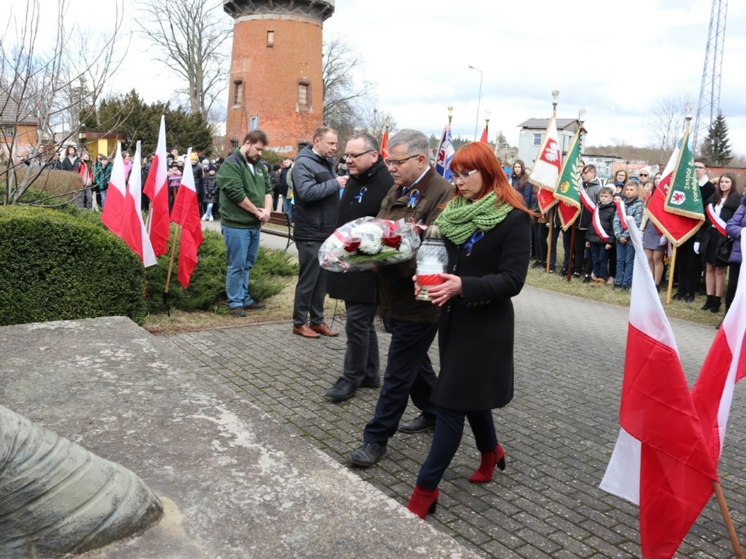 Uczestnicy manifestacji z udziałem władz samorządowych, pocztów sztandarowych oraz delegacji instytucji, organizacji społecznych i młodzieży szkolnej prowadzeni przez Młodzieżową Orkiestrę Dętą przemaszerowali przed pomnik żołnierza przy Dworcu Kolejowym.