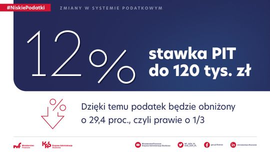 Proponujemy obniżenie stawki PIT z 17 proc. do 12 proc. w progu podatkowym 120 tys. zł. Niższa stawka oznacza obniżenie podatku o 29,4%, czyli prawie o 1/3.