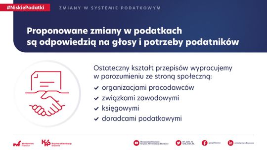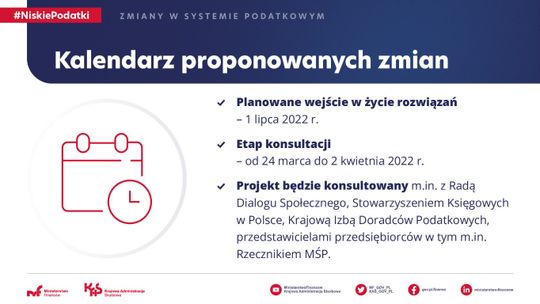 Projekt będzie konsultowany m.in. z Radą Dialogu Społecznego, Stowarzyszeniem Księgowych w Polsce, Krajową Izbą Doradców Podatkowych, przedstawicielami przedsiębiorców w tym m.in. Rzecznikiem MŚP.