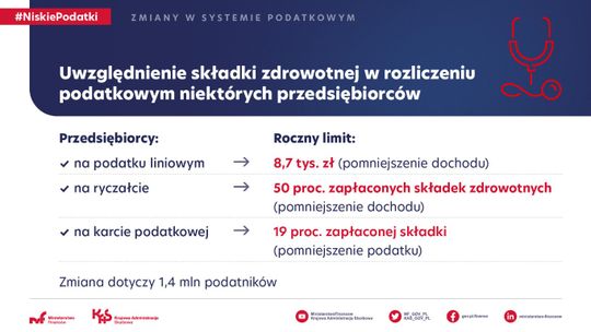W przypadku liniowców limit wyniesie 8,7 tys. zł (pomniejszenie dochodu). Dla ryczałtowców – 50% zapłaconych składek zdrowotnych (pomniejszenie przychodu). Natomiast dla podatników na karcie – 19 proc. zapłaconej składki (pomniejszenie podatku). W sumie zmiana dotyczy 1,4 mln podatników.
