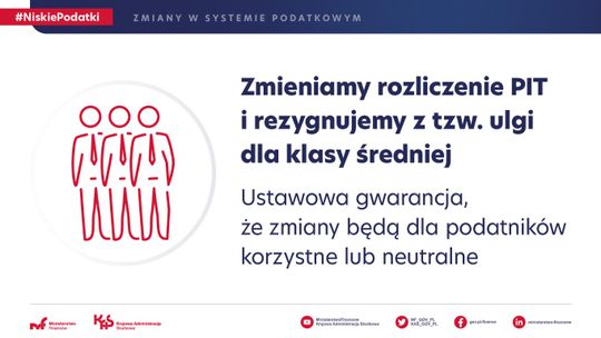 Chcemy zrezygnować z tzw. ulgi dla klasy średniej. Jednocześnie dajemy gwarancję, że zmiany będą dla podatników korzystne lub neutralne. Osoby dla których rozliczenie z tzw. ulgą dla klasy średniej okaże się bardziej opłacalne niż rozliczenie według nowego mechanizmu, będą mogły rozliczyć podatek za 2022 r. na wcześniejszych zasadach (z tzw. ulgą dla klasy średniej).