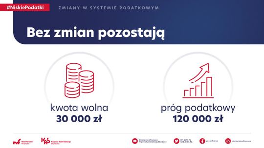 - Kwota wolna pozostanie na poziomie 30 tys. zł, a próg podatkowy na poziomie 120 tys. zł.