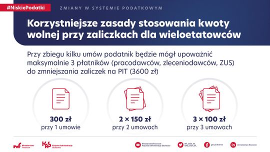W przypadku 1 umowy kwota zmniejszająca podatek wyniesie 300 zł, przy dwóch – po 150 zł, a przy trzech – po 100 zł. Dzięki temu wieloetatowcy będą mogli w pełni korzystać z kwoty wolnej już na etapie zaliczek na podatek.