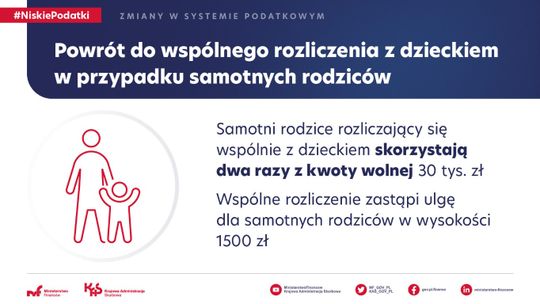 Odpowiadamy na postulaty samotnych rodziców i przywracamy możliwość wspólnego rozliczenia z dzieckiem. Dzięki temu samotni rodzice dwukrotnie skorzystają z kwoty wolnej wynoszącej 30 tys. zł. Wspólne rozliczenie zastąpi wprowadzoną od 1 stycznia 2022 r. ulgę w wysokości 1500 zł.