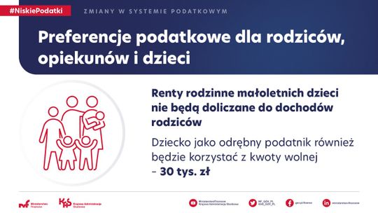 Chcemy też, by renty rodzinne małoletnich dzieci nie były doliczane do dochodów rodziców. To oznacza, że dziecko będzie traktowane jako odrębny podatnik i obok rodzica korzystać będzie z kwoty wolnej 30 tys. zł.