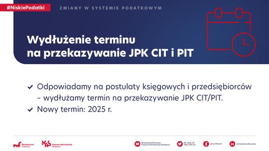 Odpowiadamy na postulaty księgowych i przedsiębiorców. Dlatego wydłużamy termin na przekazywanie JPK_CIT i JPK_PIT. Nowy termin przekazywania JPK w zakresie ksiąg rachunkowych przesunięty zostanie na 2025 r.