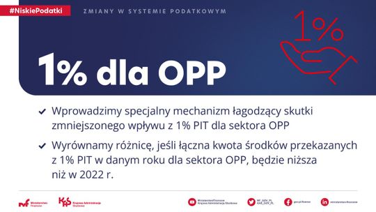 Przygotowaliśmy specjalny mechanizm łagodzący skutki zmniejszonego wpływu z 1% PIT dla sektora OPP. Dzięki niemu wyrównamy różnicę w sytuacji, gdy łączna kwota środków przekazanych z 1% PIT w danym roku dla OPP będzie niższa niż w 2022 r.