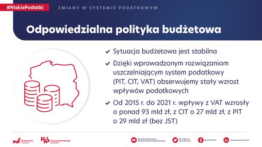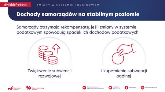 Dzięki dobrej sytuacji gospodarczej oraz wprowadzonym rozwiązaniom uszczelniającym obserwujemy stały wzrost wpływów podatkowych. Proponowane zmiany nie dotkną samorządów. JST otrzymają rekompensatę polegającą na zwiększeniu subwencji rozwojowej lub uzupełnieniu subwencji ogólnej.