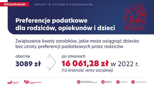 Proponujemy również zwiększenie kwoty zarobków, jakie może osiągnąć dziecko bez utraty preferencji podatkowych przez rodziców. Kwota ta wzrośnie z 3089 zł do 16 061,28 zł w 2022 r. (12-krotność renty socjalnej).