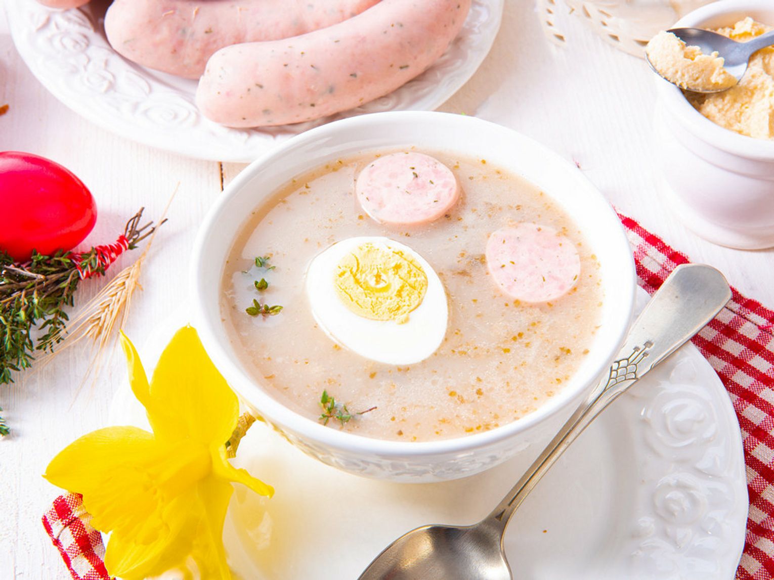 - Do garnka z cebulą, czosnkiem i boczkiem wlać bulion, dodać ziemniaki oraz białą kiełbasę, majeranek, ziele angielskie i liść laurowy. Gotować około 20-25 minut, aż ziemniaki będą miękkie.