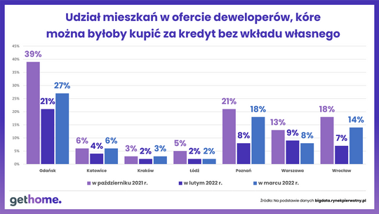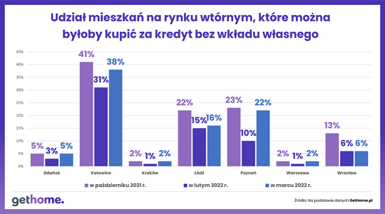 Z kolei na rynku wtórnym sporym wyzwaniem byłoby obecnie znalezienie atrakcyjnego mieszkanie za kredyt bez wkładu własnego w Warszawie i Krakowie. Nawet, jeśli liczba lokali w rzeczywistości jest tam większa niż wskazywałyby na to dane portalu GetHome.pl (podane są w nim same unikalne oferty, czyli bez duplikatów), to udział prawdopodobnie niewiele by się różnił. Za to zwłaszcza w Katowicach, Poznaniu i Łodzi potencjalni nabywcy raczej bez problemu znajdą lokum spełniające kryteria cenowe.
