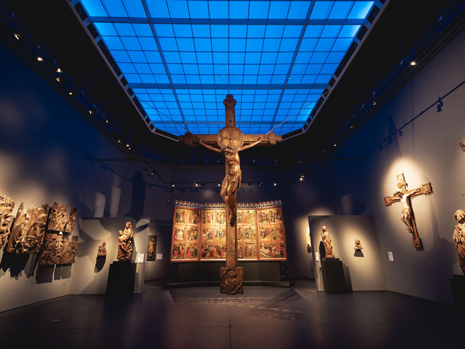 Głównym akcentem wystawy jest imponujący rozmiarami, a zarazem subtelny w wyrazie Krucyfiks Kamieński – perła kolekcji sztuki średniowiecznej szczecińskiego muzeum. Umieszczony w centrum monumentalnej hali, podobnie jak niegdyś we wnętrzu kościoła, przypomina o uniwersalnym i powszechnym charakterze zbawienia dokonanego na krzyżu oraz wyznacza oś świata, wokół której koncentrowała się rzeczywistość epoki chrześcijańskiego średniowiecza.