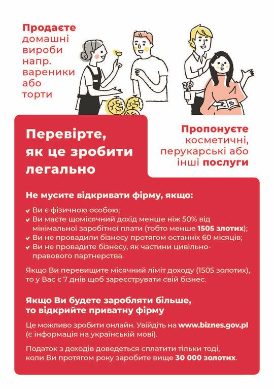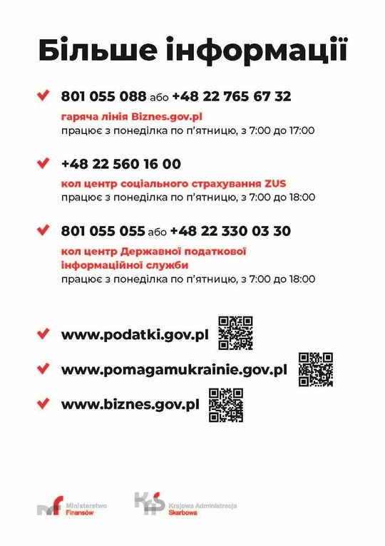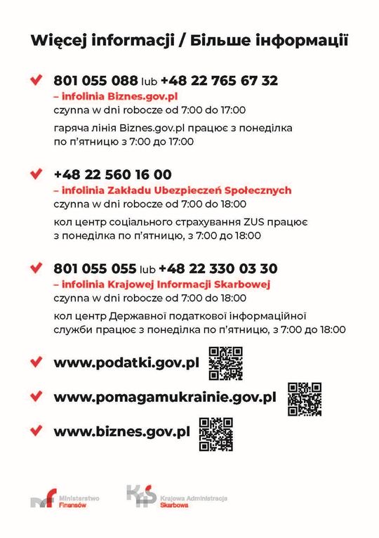 - 801 055 088 lub +48 22 765 67 32 – infolinia Biznes.gov.pl czynna w dni robocze od 7:00 do 17:00 / гаряча лінія Biznes.gov.pl працює з понеділка по п’ятницю з 7:00 до 17:00