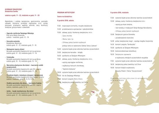 Na każdy dzień Zamek przygotował bogaty program artystyczny, także wiele bezpłatnych atrakcji i zajęć dla dzieci. Prócz Mikołaja i zagrody prawdziwych reniferów na najmłodszych czekać będą m. in. kolorowa karuzela wenecka, autko-bujak. Będzie fotobudka, specjalna bombka dla miłośników selfie. Można wziąć udział w ciekawych warsztatach np. tworzenia ozdób świątecznych czy przygotowywania lizaków. Kino Zamek zapowiada projekcje bajek o tematyce zimowej i świątecznej. Aktorzy szczecińskich teatrów czytać będą bajki.