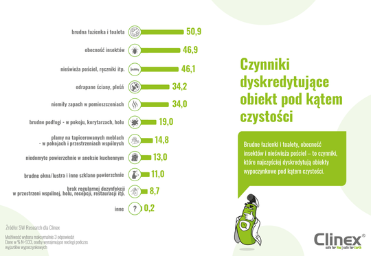 Polacy chcą wypoczywać w czystych miejscach. W oczach połowy z nas obiekt wypoczynkowy pod kątem czystości dyskredytują brudne łazienki i toalety, a także obecność insektów oraz nieświeża pościel i ręczniki. Te czynniki sprawiają, że hotel, czy pensjonat już nigdy nie będzie wybrany przez respondentów jako miejsce wypoczynku.