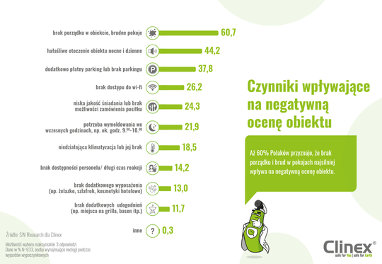 - Aż 60% Polaków przyznaje, że to brak porządku i brud w pokojach najmocniej wpływa na negatywną ocenę obiektów, w których wynajmują noclegi podczas wyjazdów wakacyjnych.