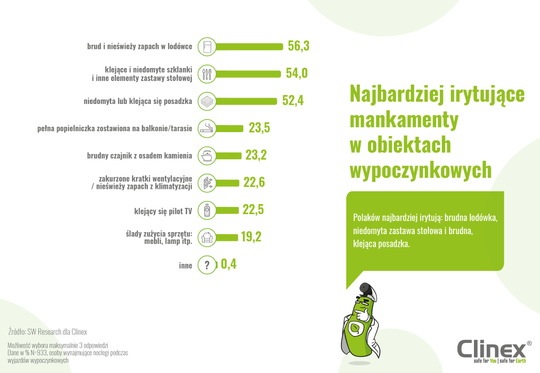 – Brudna lodówka, niedomyta zastawa stołowa i brudna, klejąca posadzka – z naszego badania wynika, że to najbardziej irytuje Polaków pod względem czystości. Na wygląd i czystość tych elementów wskazała ponad połowa ankietowanych. Lista wrażliwych na ocenę gości przedmiotów jest jednak dłuższa. Zauważamy jednocześnie, że u właścicieli obiektów wzrosła świadomość dotycząca odpowiedniego przygotowania się pod tym kątem na przyjęcie gości – mówi Wojciech Tomaszczyk, przedstawiciel Clinex.