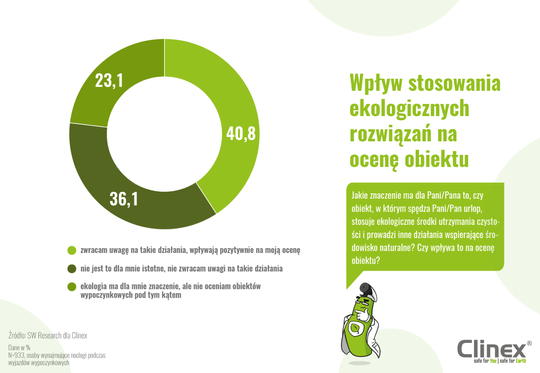 Nie tylko czystość, ale i ekologia – 64% ankietowanych w badaniu Clinex zwraca uwagę na działania proekologiczne prowadzone przez osoby zarządzające obiektami wypoczynkowymi. Ponad połowa z nich podkreśliła, że stosowanie w obiekcie ekologicznych środków utrzymania czystości i prowadzenie innych działań wspierających środowisko naturalne, pozytywnie wpływa na ocenę obiektu. Coraz częściej spotykamy się z komunikatami dotyczącymi zielonej polityki – hotele informują o stosowaniu ekologicznych materiałów, przypominają o zużyciu wody – zachęcając tym gości do aktywnego wspierania takich działań. W wynikach badania widać już tego efekty.
