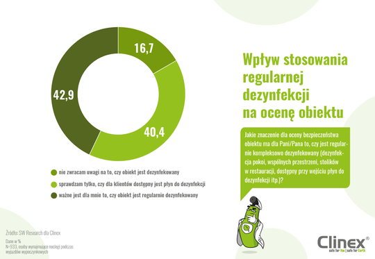 Choć czasy największych sanitarnych obostrzeń związanych z pandemią mamy już za sobą, to wielu Polaków zmieniło być może na zawsze postrzeganie higieny i związanego z nią bezpieczeństwa. Tylko niecałe 17% ankietowanych przyznaje, że nie zwraca uwagi na to, czy obiekt jest dezynfekowany. Dla 43% badanych ważne jest to, czy obiekt jest regularnie dezynfekowany, a dla 40% istotna jest obecność płynu do dezynfekcji.