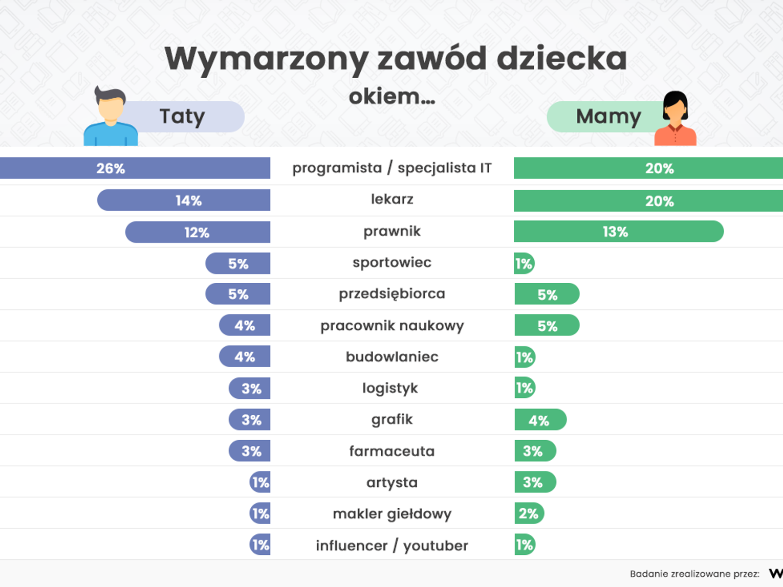 Numerem jeden w opinii dorosłych Polaków (posiadających i nieposiadających dzieci) jest programista/specjalista ds. IT (22%). Na drugim miejscu lekarz (16%), a podium domyka prawnik (11%). W TOP10 znaleźni się jeszcze kolejno: pracownik naukowy, przedsiębiorca, sportowiec, grafik, finansista, farmaceuta, artysta. Najmniej przyszłość swoich dzieci Polacy widzą w roli marketingowców, dziennikarzy, rekruterów, Youtuberów i handlowców.