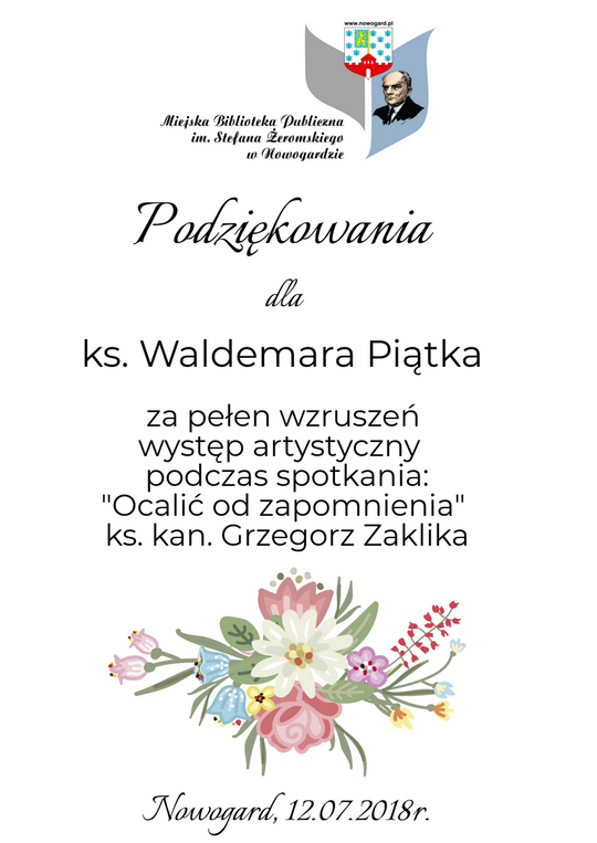 Tego dnia zebrani mieli przyjemność wysłuchać wspólnego występu muzycznego Pani Marty Laskowskiej i ks. Waldemara Piątka. Była to prawdziwa uczta dla duszy. Wśród obecnych gości była również bliska ks. Grzegorzowi osoba - Pani Barbara Szcześniak. Życiorys omawianej postaci przedstawiła moderatorka spotkań - Pani Kazimiera Fecak. Następnie Pan Franciszek Karolewski zaprezentował obszerną galerię zdjęć. W trakcie prezentacji fotografii zebrani goście wspominali ks. Grzegorza przy kawie, herbacie oraz domowym cieście.