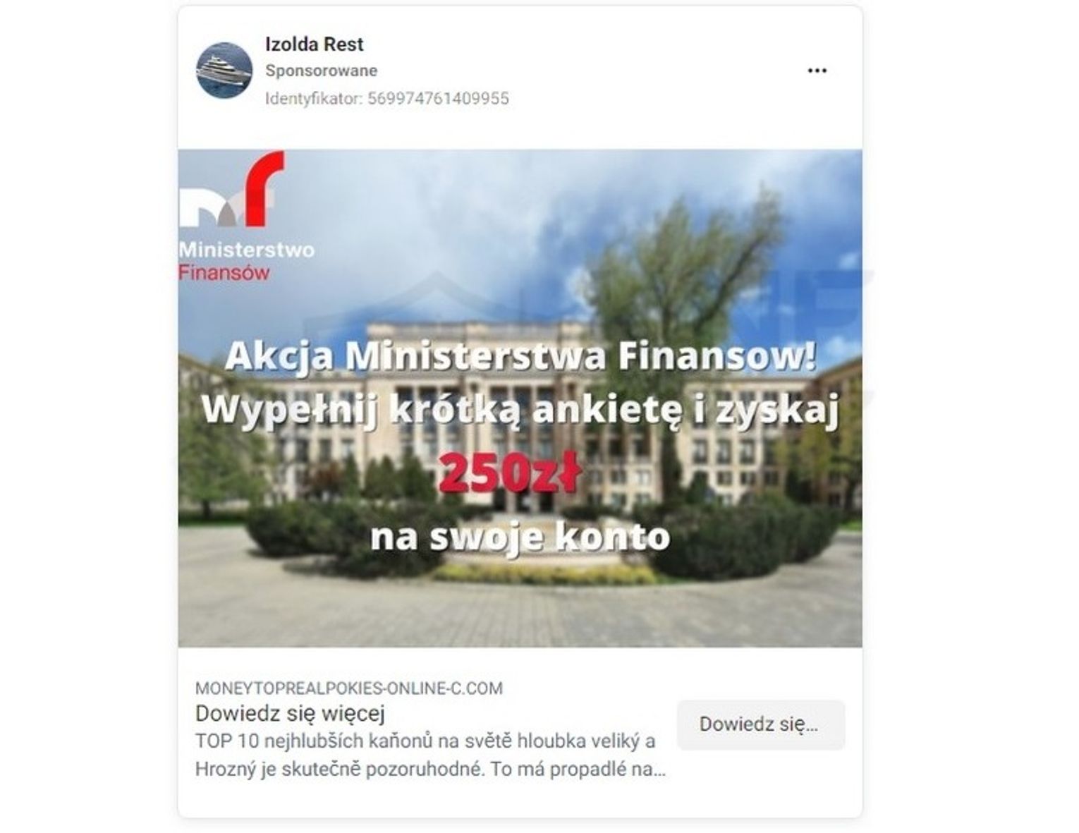 - Przestrzegamy przed fałszywymi reklamami, w których cyberprzestępcy podszywają się pod Ministerstwo Finansów.