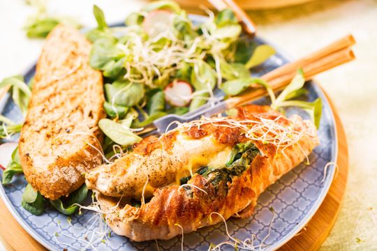 - Na jedną z połówek rozciętego płata mięsa połóż po 1 plastrze sera cheddar, na to połóż porcję szpinaku i po drugim plastrze sera.