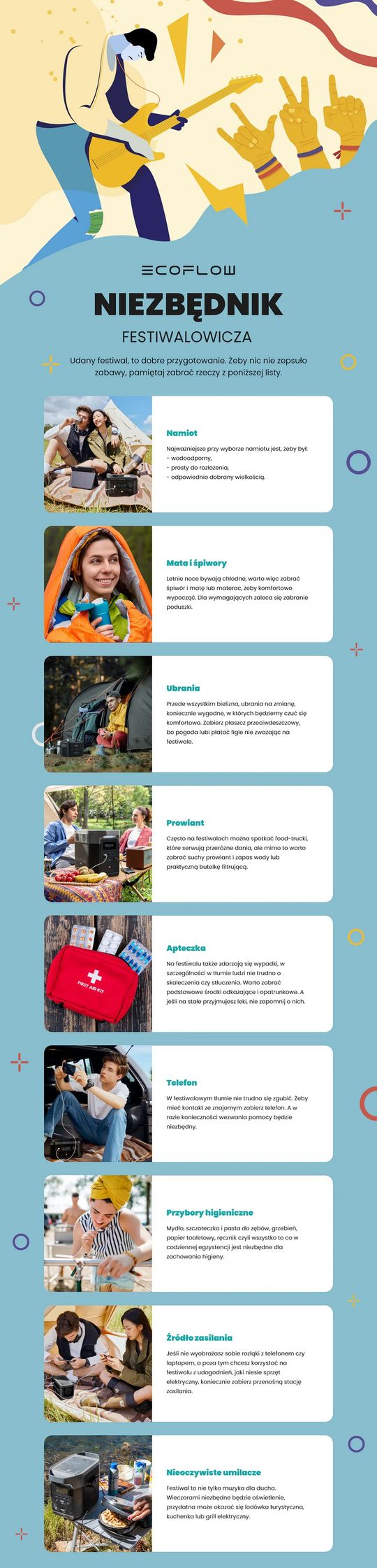 Do największych i najpopularniejszych polskich festiwali można zaliczyć m.in. Open’er Festival w Gdyni, Orange Warsaw Festival, Kraków Live Festival czy Pol’and’Rock Festival. Na wszystkich muzyka rozbrzmiewa przez dwa, trzy, a nawet cztery dni. Udział w festiwalu to okazja, by powiedzieć stop lenistwu, oderwać się od szarej rzeczywistości i skończyć z siedzeniem w domu. Festiwal to także możliwość, by dołączyć do akcji „Żyj pełną MOCą”.– Akcja polega na promowaniu przebywania na świeżym powietrzu, podróżowania i próbowania nowych, interesujących aktywności. A udział w festiwalu jest świetną okazją, by doświadczyć tego wszystkiego naraz. – wyjaśnia Paweł Tomiczek z EcoFlow. Każdy duży festiwal odbywa się pod gołym niebem, więc, jeśli chce się uczestniczyć w festiwalu od początku do końca, należy się do tego odpowiednio przygotować.