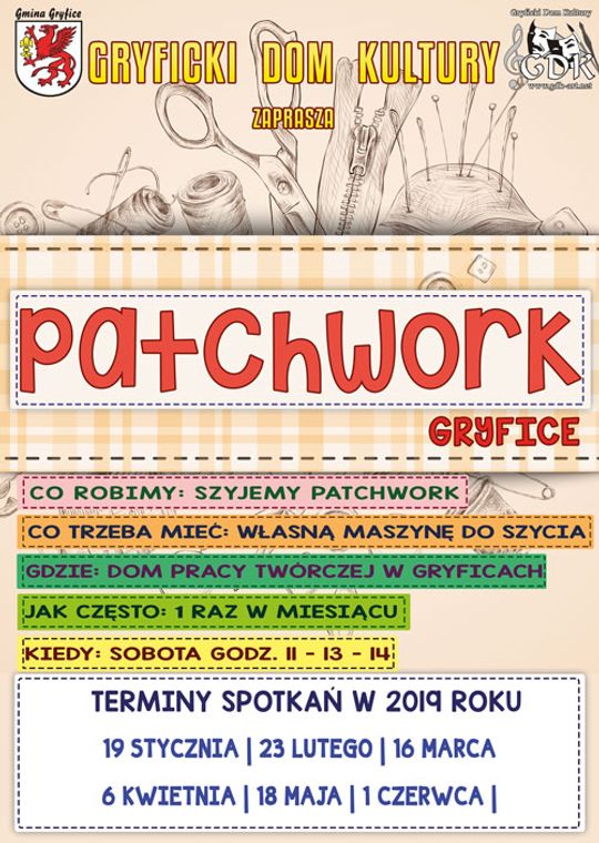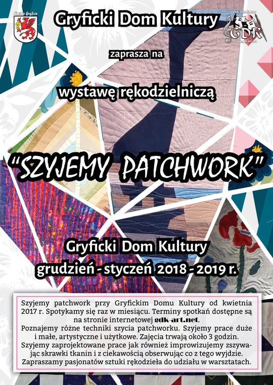 Szyjemy patchwork - warsztaty rękodzielnicze działające przy Gryfickim Domu Kultury od kwietnia 2017 r. Spotkania odbywają się się raz w miesiącu, a terminy spotkań dostępne są na stronie internetowej gdk-art.net. Podczas warsztatów uczestnicy poznają różne techniki szycia patchworku, uczą się szycia prac dużych i małych, artystycznych i użytkowych. Jedno spotkanie trwa około 3 godzin.