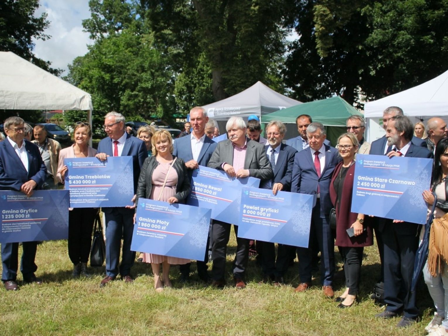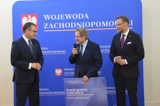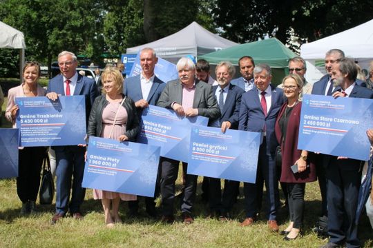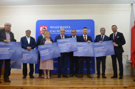 Z rąk wiceszefa MSWiA Pawła Szefernakera oraz Wojewody Zachodniopomorskiego Zbigniewa Boguckiego – odebrali symboliczne czeki potwierdzające przyznane dofinansowania m.in. Starosta Gryficki Ryszard Chmielowicz, Burmistrz Gryfic Andrzej Szczygieł, Burmistrz Trzebiatowa Józef Domański, Wójt Gminy Brojce Michał Zinowik, Wójt Gminy Karnice Lech Puzdrowski, Wójt Gminy Rewal Konstanty Tomasz Oświęcimski oraz Skarbnik Gminy Płoty Małgorzata Gołąb.