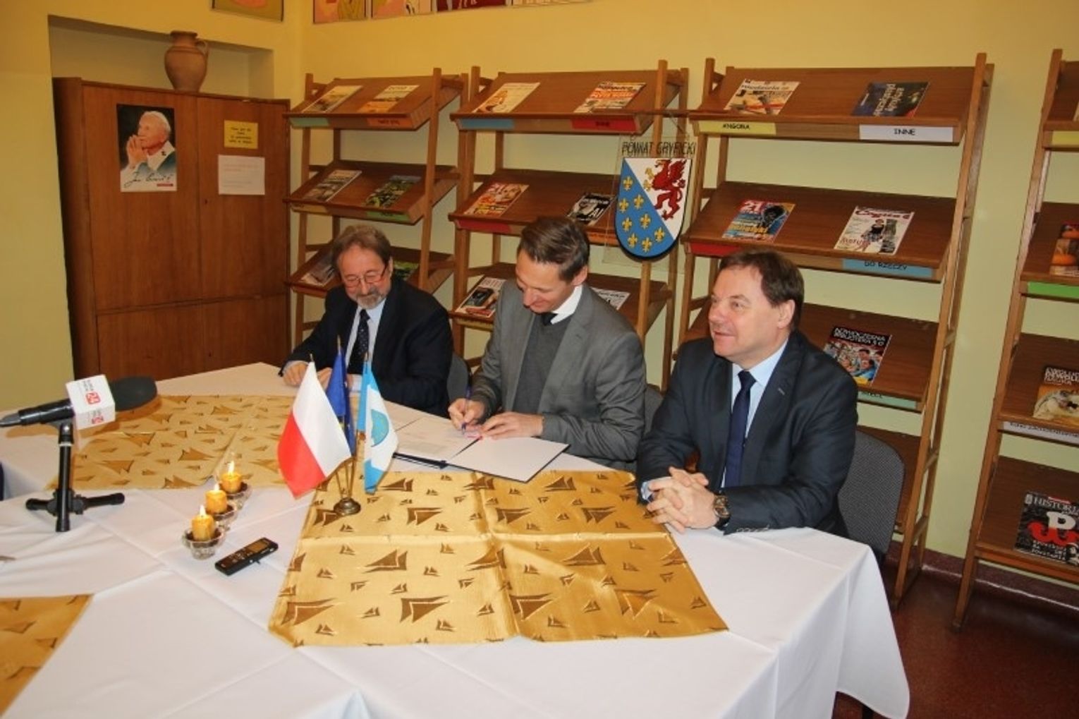 W sobotę 15 grudnia w ZSP im. Wincentego Witosa w Płotach Marszałek Województwa Zachodniopomorskiego Olgierd Geblawicz oraz Starosta Gryficki Ryszard Chmielowicz podpisali umowę na dofinansowanie projektu ze środków Unii Europejskiej w ramach Europejskiego Funduszu Społecznego, wkład własny powiatu gryfickiego wyniesie 200 tys. zł. W podpisaniu umowy uczestniczyli także wicestarosta powiatu gryfickiego Waldemar Wawrzyniak, dyrektor Wydziału Edukacji Starostwa Powiatowego Marta Łakomy-Zinowik oraz dyrektor ZSP im. W. Witosa Wiesław Buchwał.