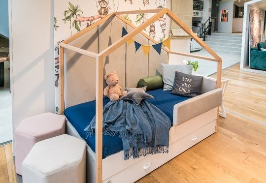 Drygą aranżację zdominowały klimaty dziecięce w jasnej tonacji i prostej, skandynawskiej konstrukcji, uzupełnione o delikatny akcent w intensywnej kolorystyce. Bazę meblową tworzy kolekcja dziecięca marki MEBLIK w bieli i drewnie, której prostotę konstrukcji łagodzą lekkie reliefy na frontach. Oczywiście nie może obyć się bez łóżka z konstrukcyjną nastawką w formie domku, który stanowi idealny plac zabaw dla dziecka. W podstawę łózka wbudowane zostały pojemne szuflady, które zgromadzą wszystkie skarby malucha i pozwolą utrzymać porządek.