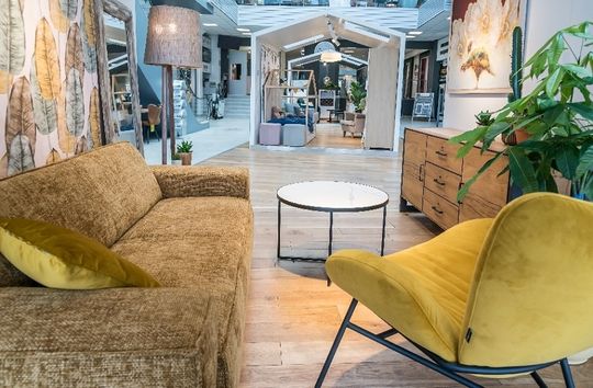 Na uwagę zasługuje też lampa ze zintegrowanym stolikiem z salonu ANPA, jakby żywcem wyjęta z minionej epoki. Aranżacja została uzupełniona również oświetleniem górnym RAYO i roślinnością z salonu PARAPET ROŚLINY I DONICZKI.